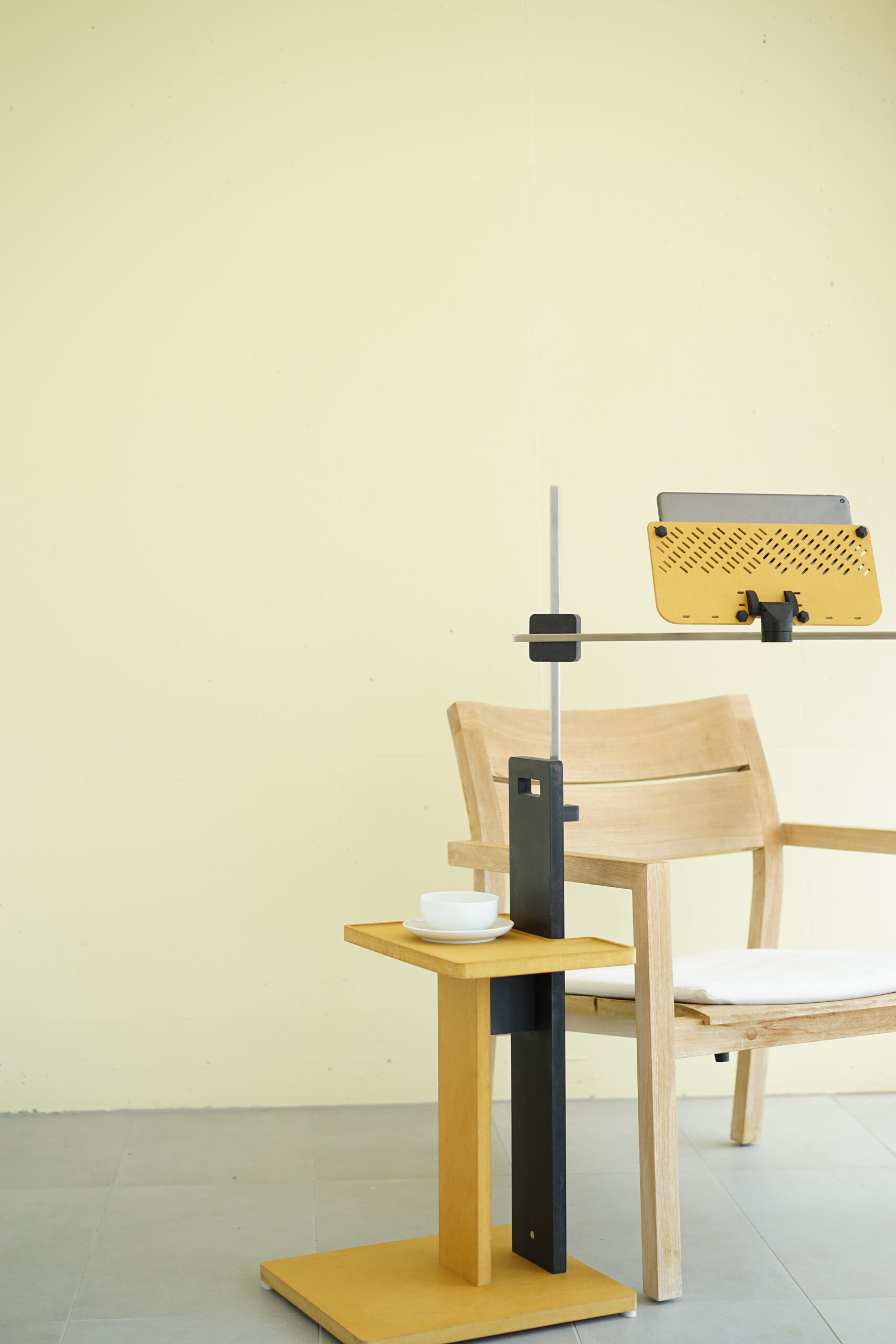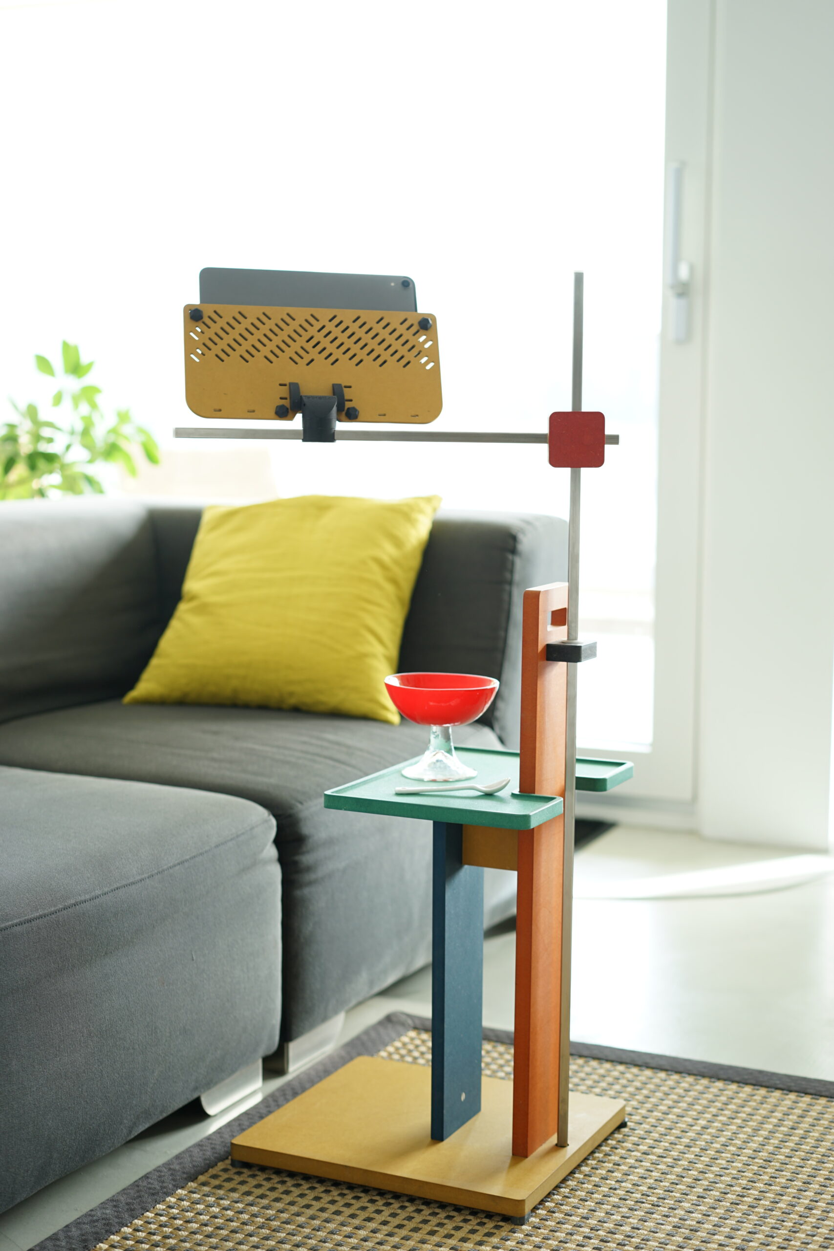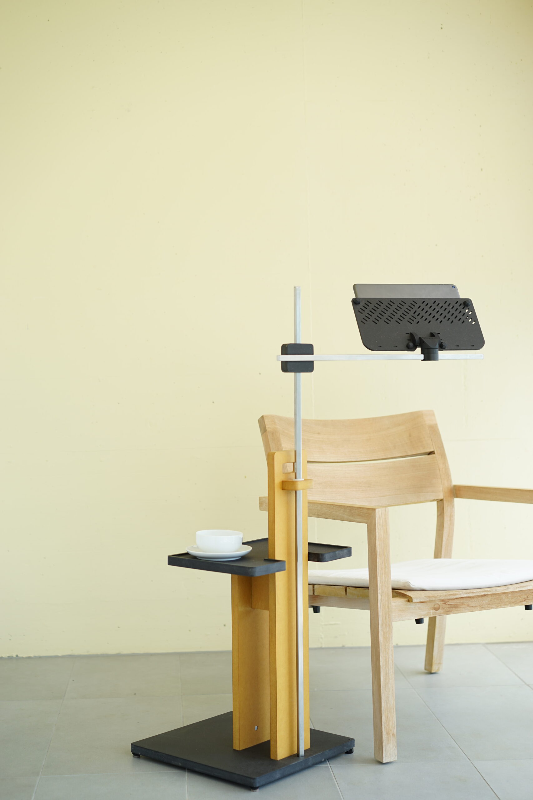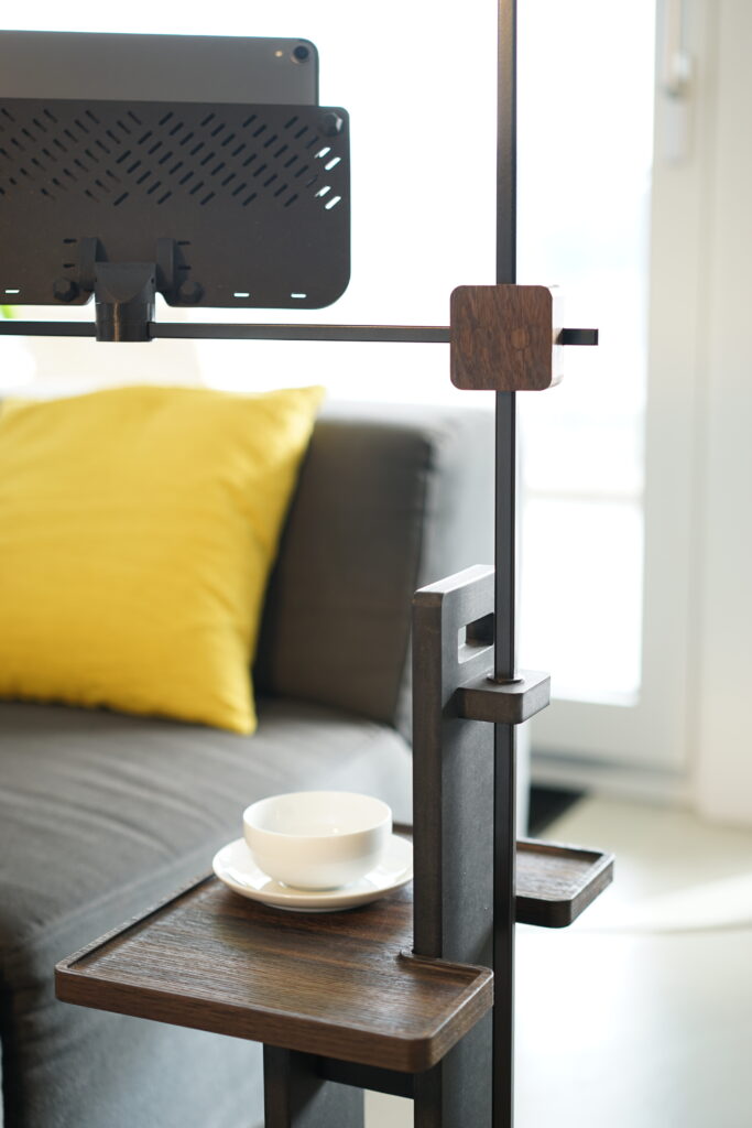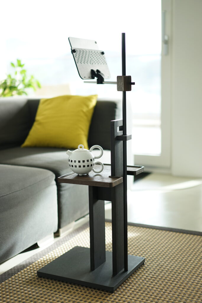 This floor stand is both tablet holder and side table! It allows you to use your tablet, e-book reader, or mobile phone comfortably when sitting, reclining, or even lying in an armchair, a bed, or on the sofa. The side table does what side tables are for! It allows you to place items such as your phone, a cup, a pen etc. within easy reach.